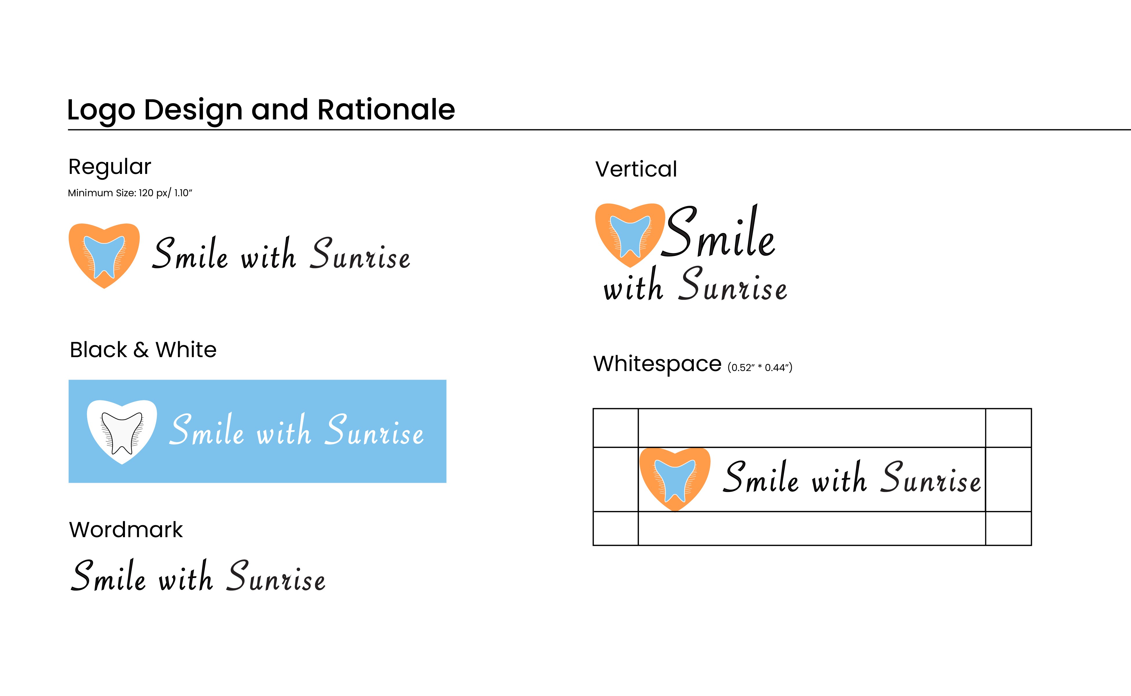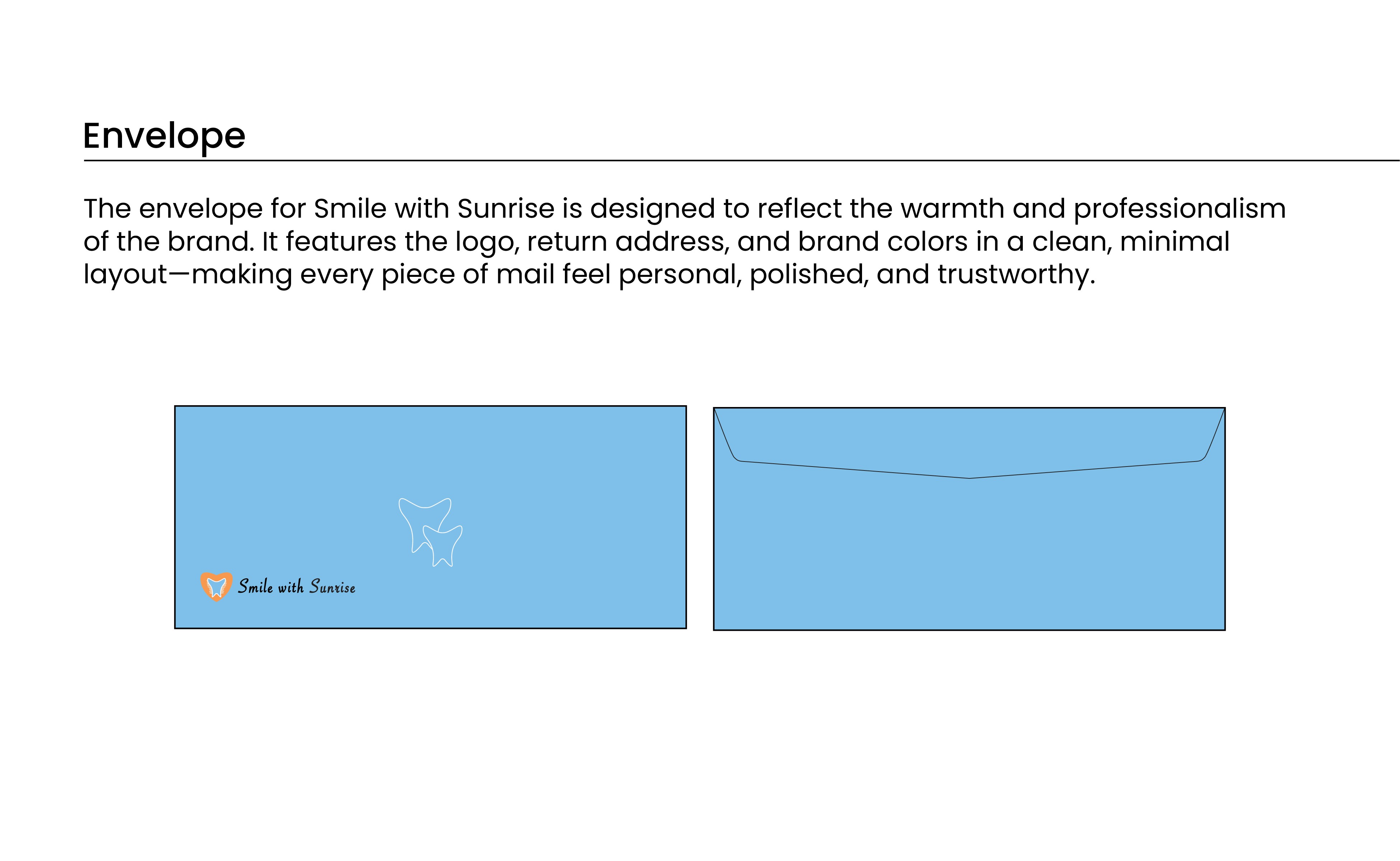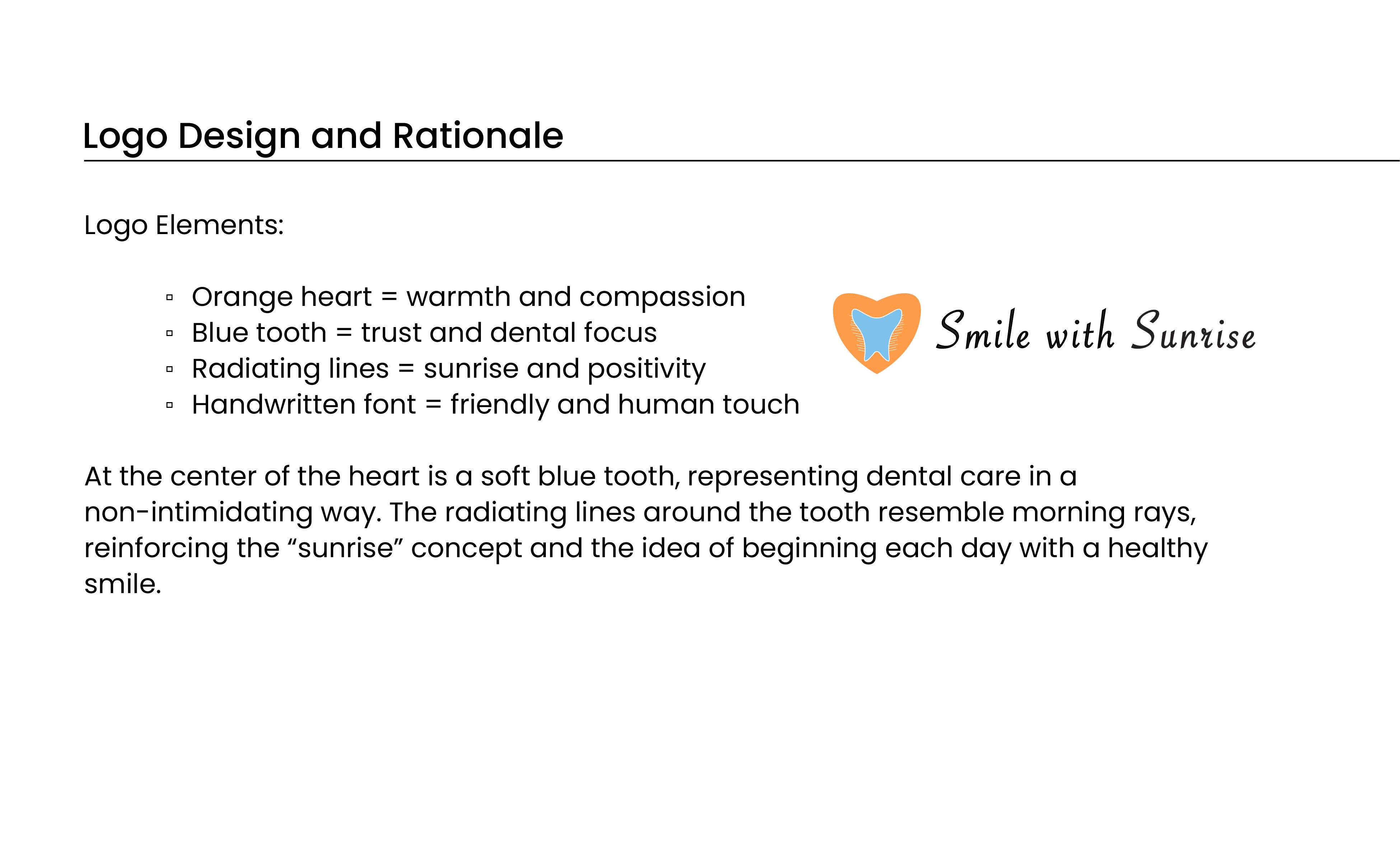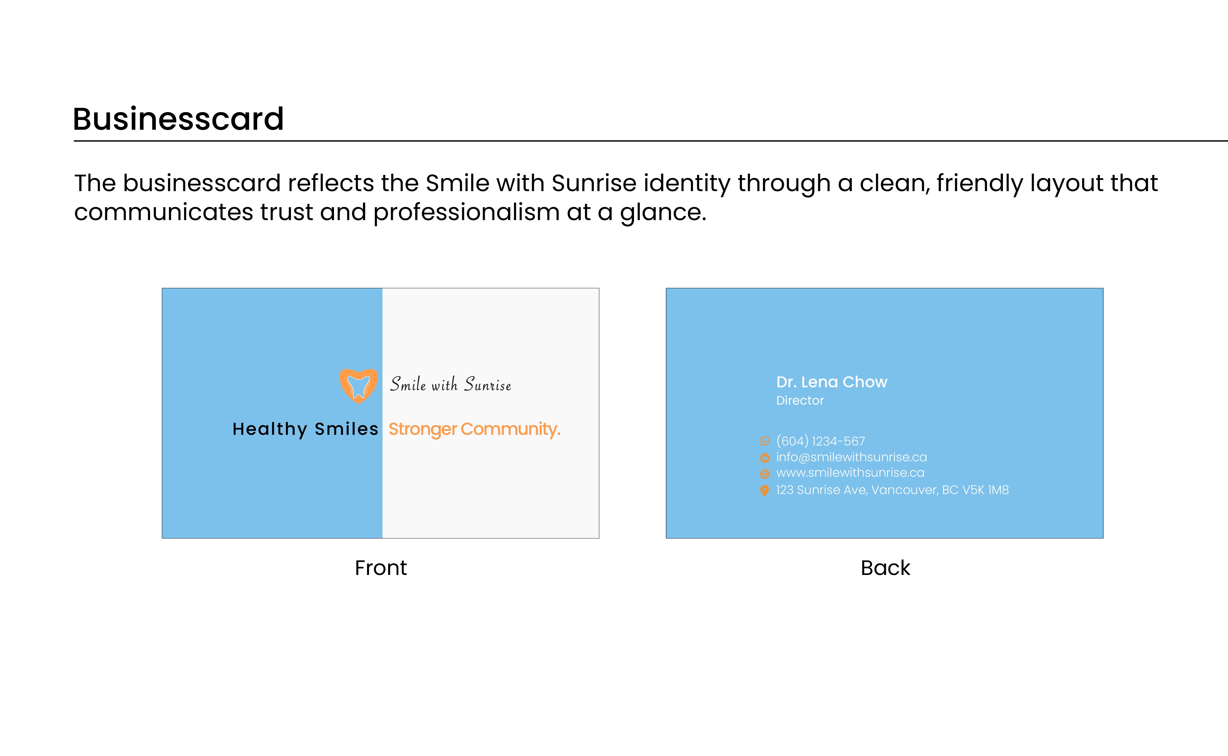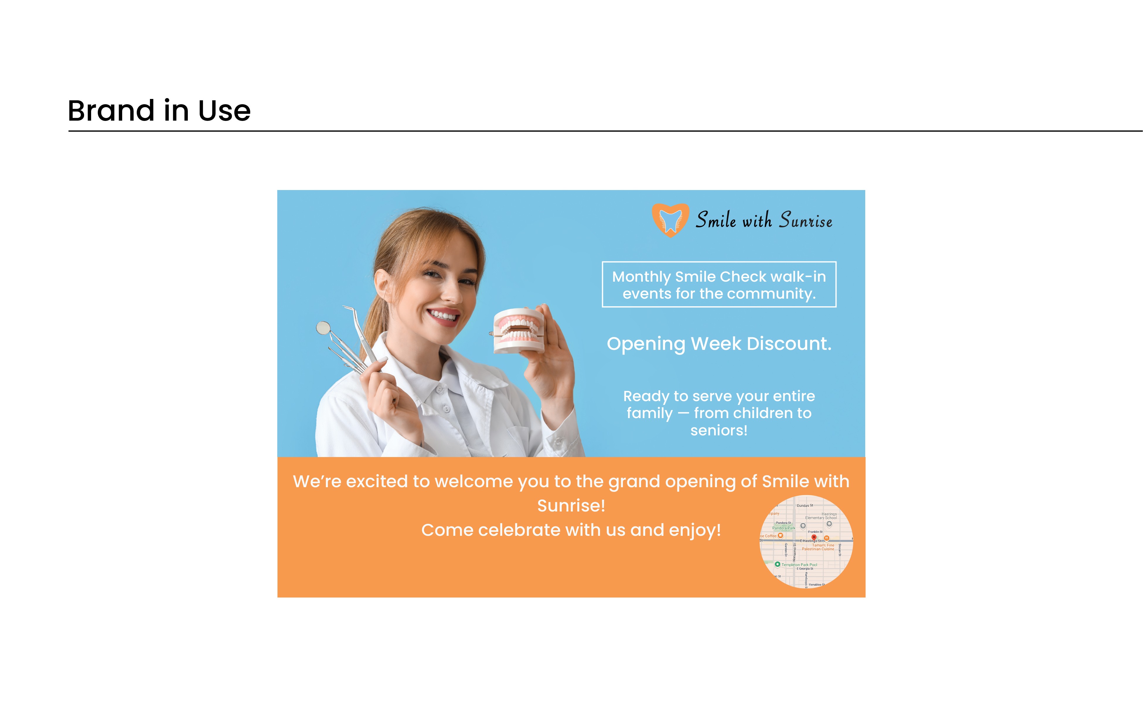 Smile with Sunrise feels warm, approachable, and community minded. The visual system creates consistency across all touchpoints and provides a clear direction for future brand applications such as signage, business cards, and digital assets.