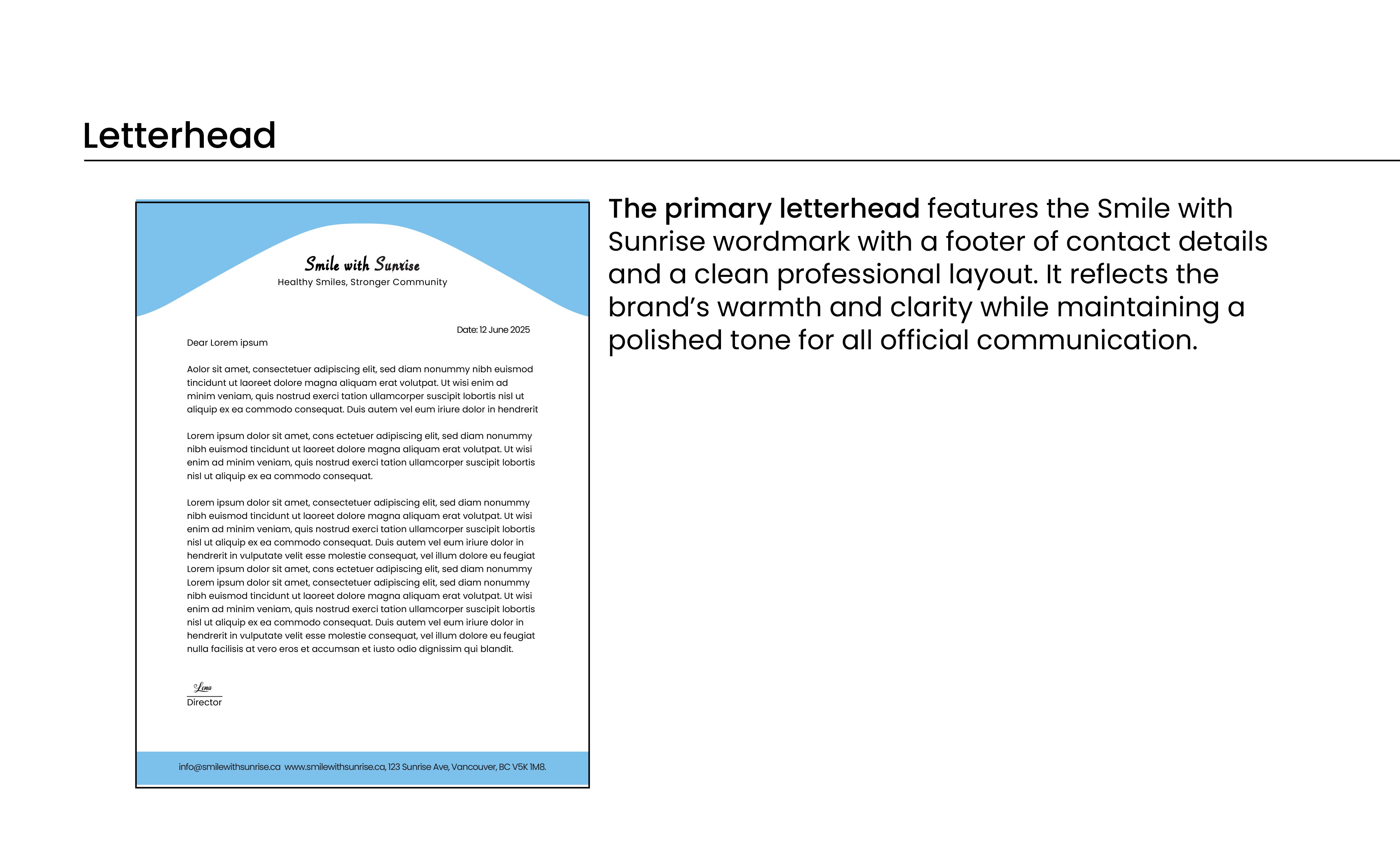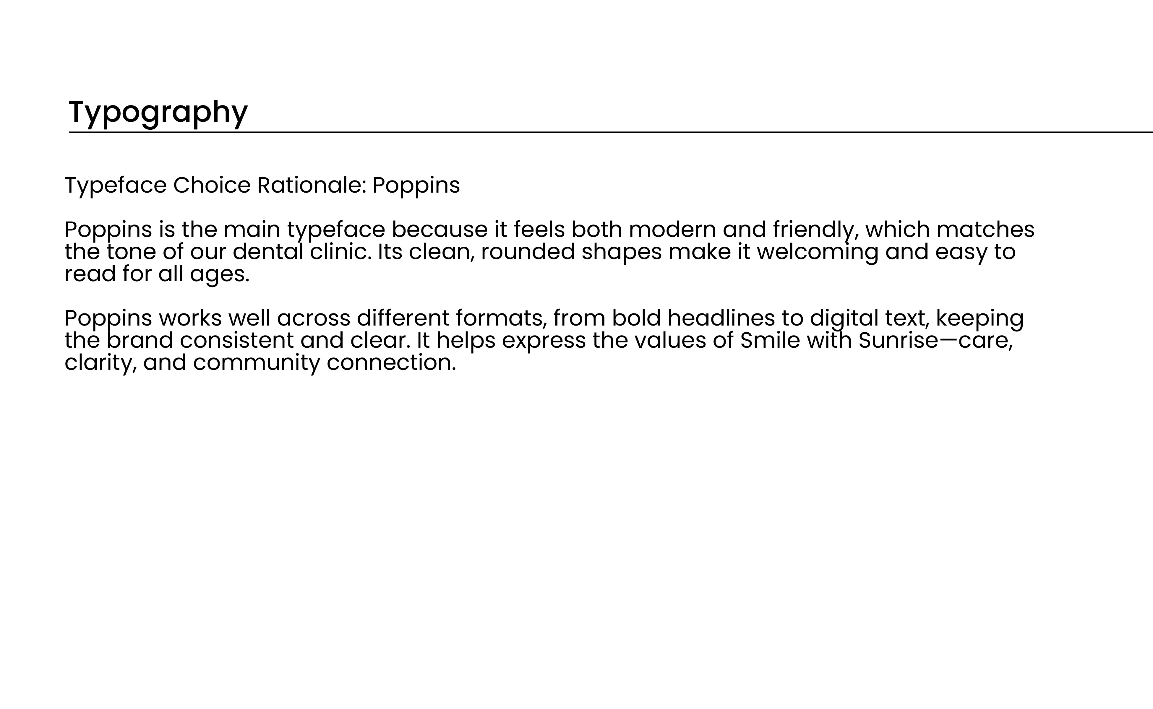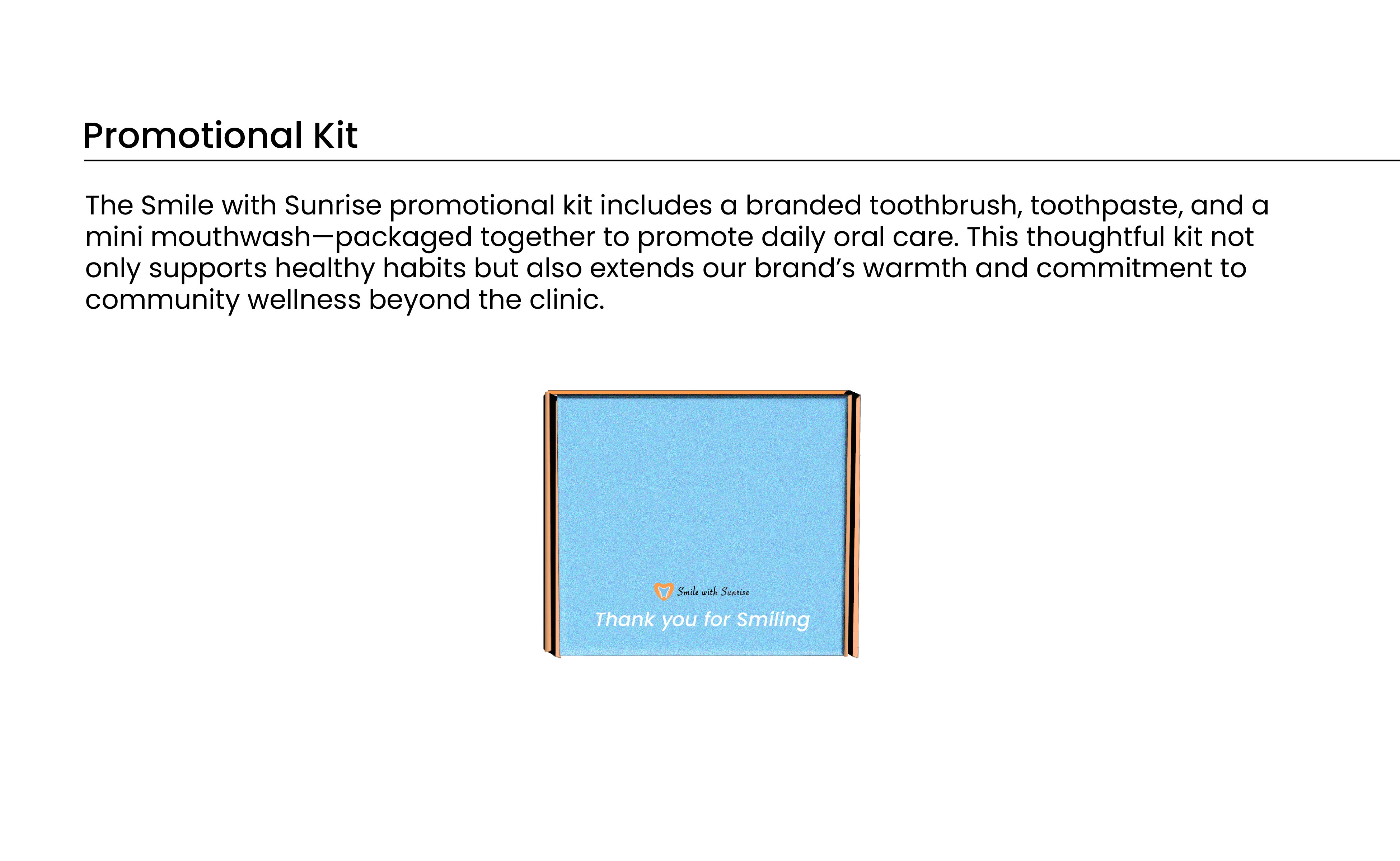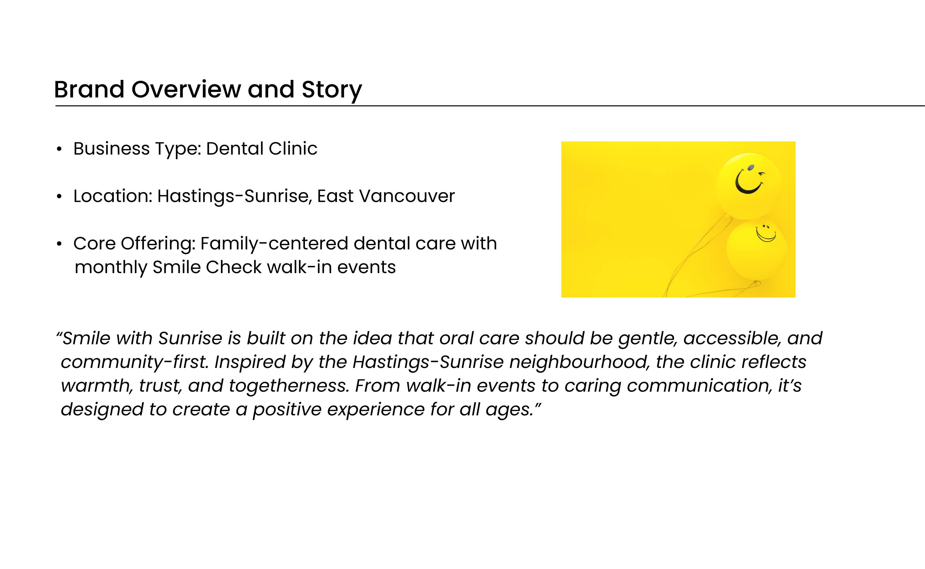 Smile with Sunrise feels warm, approachable, and community minded. The visual system creates consistency across all touchpoints and provides a clear direction for future brand applications such as signage, business cards, and digital assets.