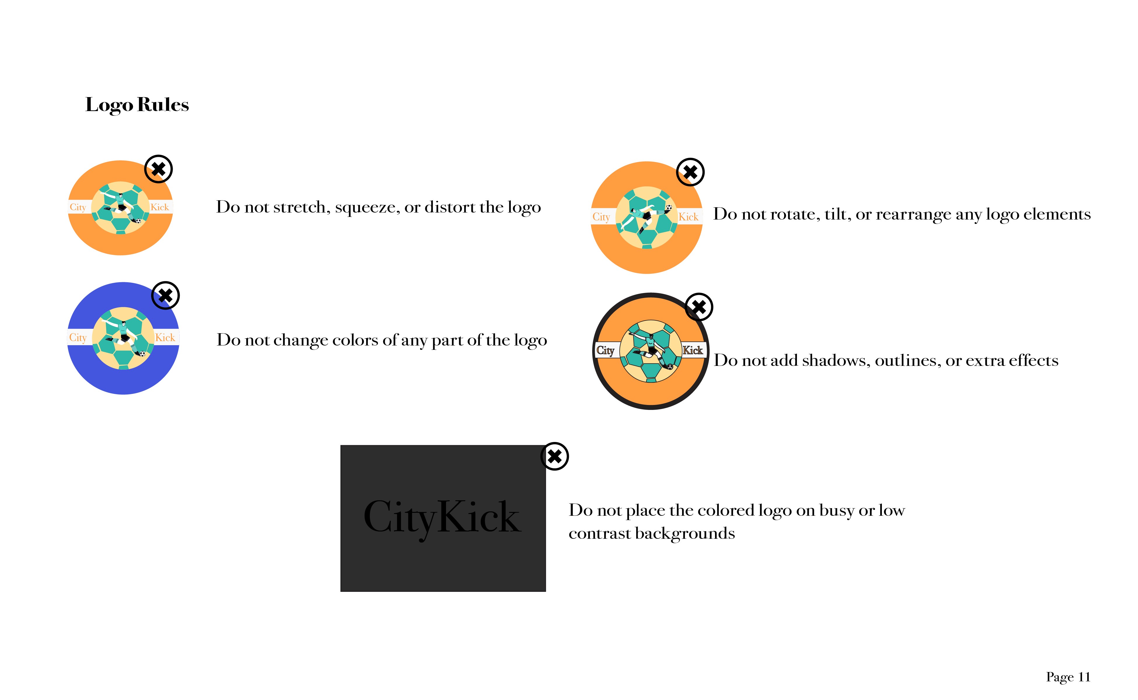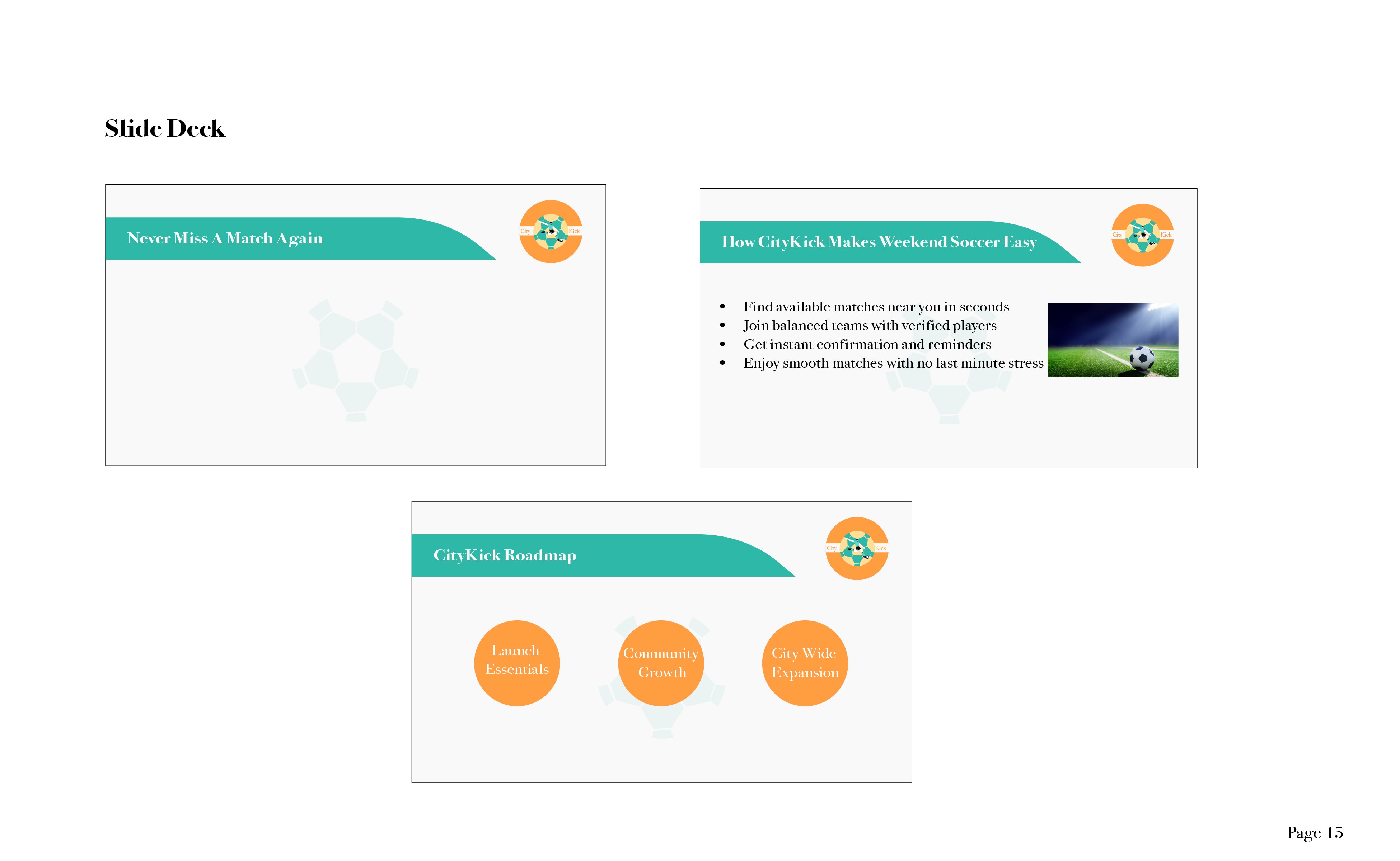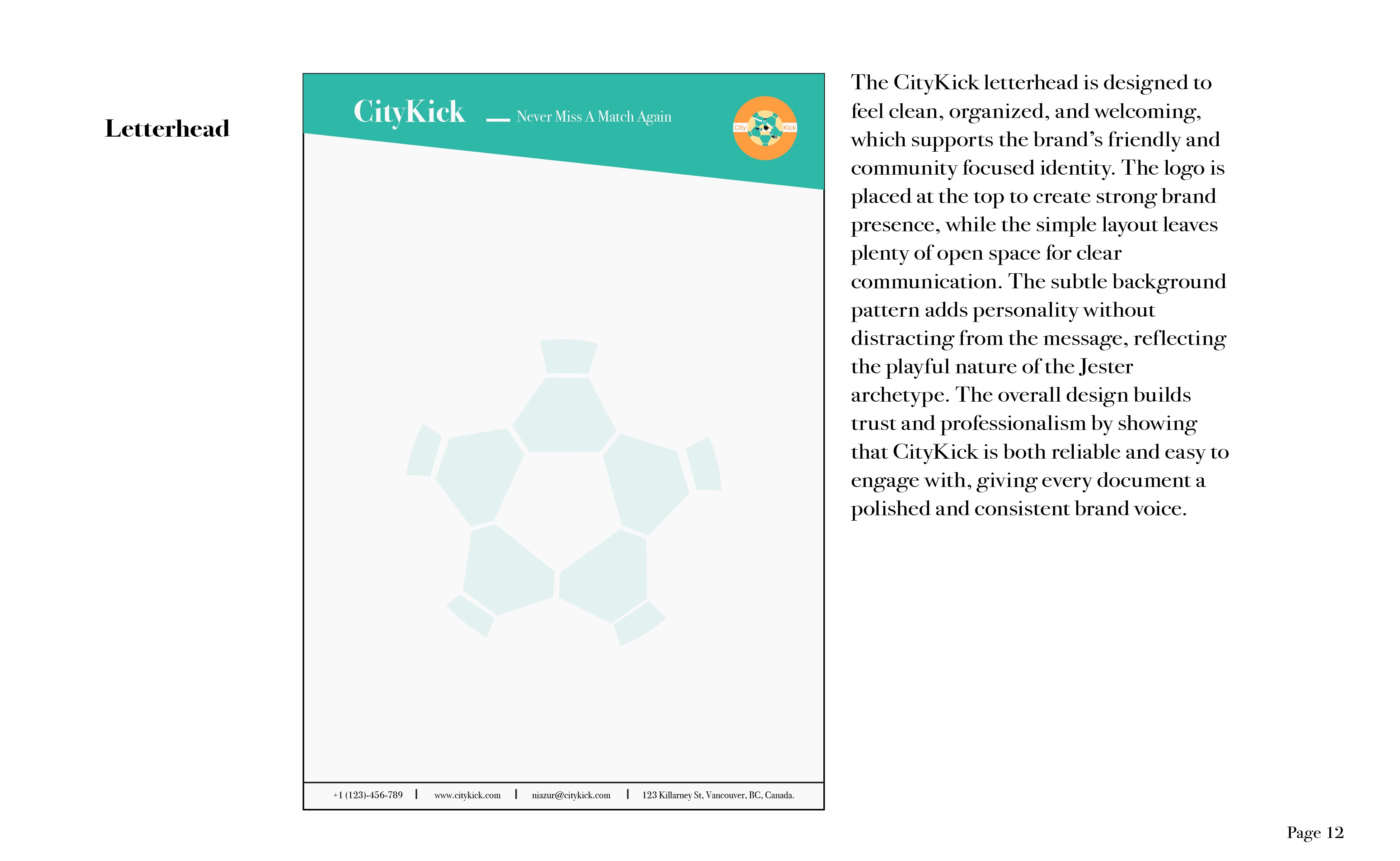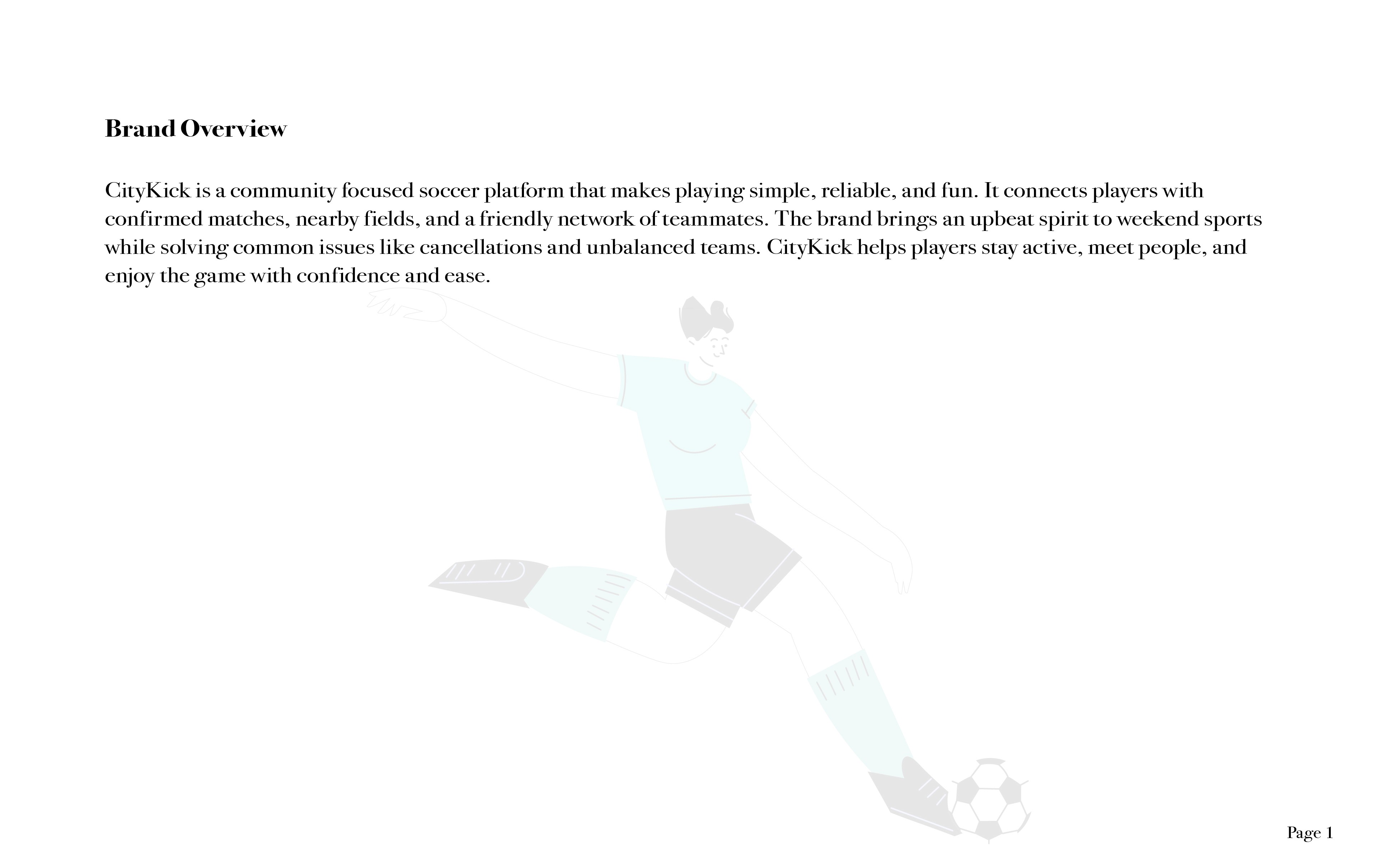 The final guideline established a strong brand that supports CityKick’s purpose: helping players organize games with confidence and speed. The identity system created visual consistency, a clear message, and a strategic direction that can be carried into app design and future marketing.