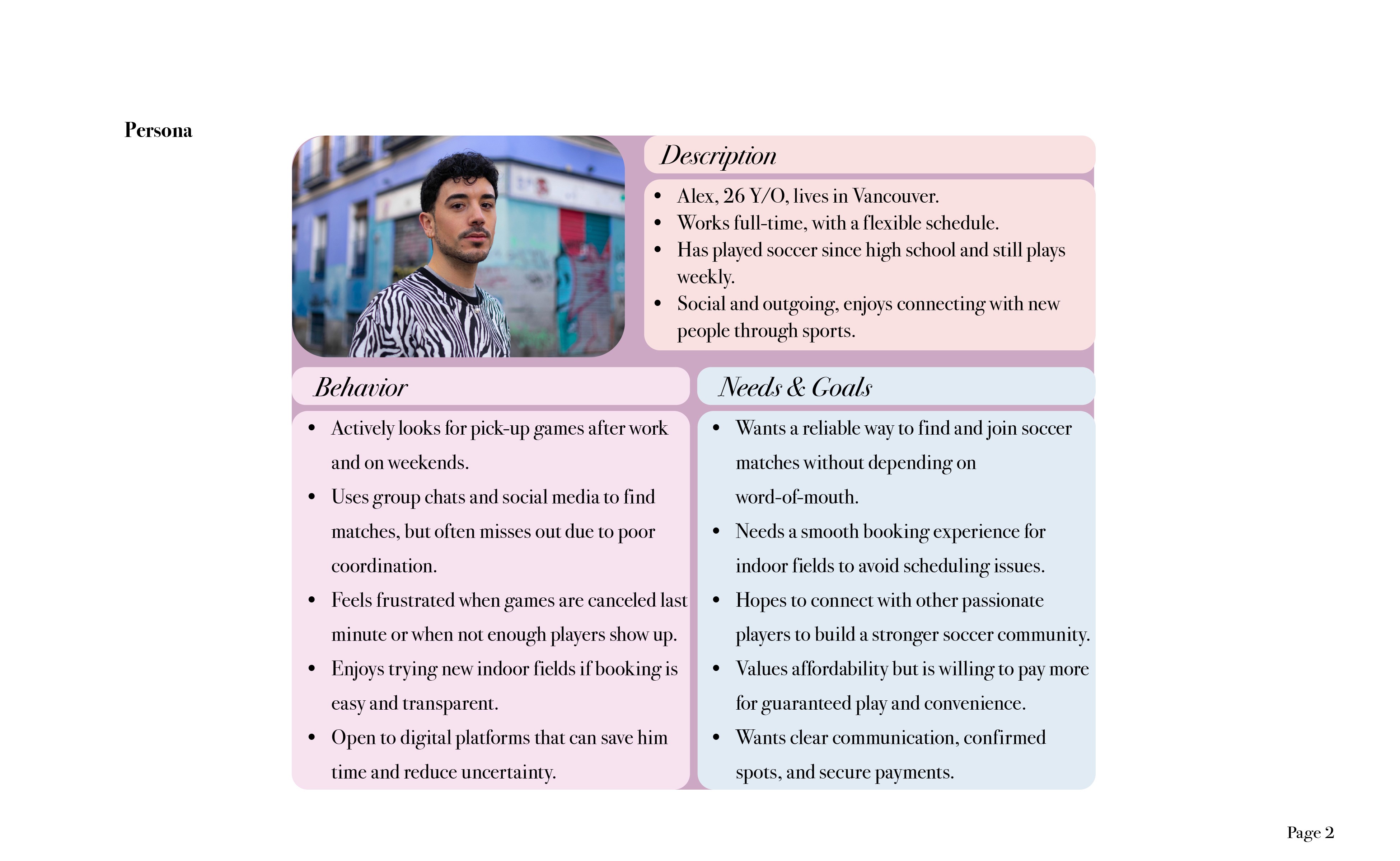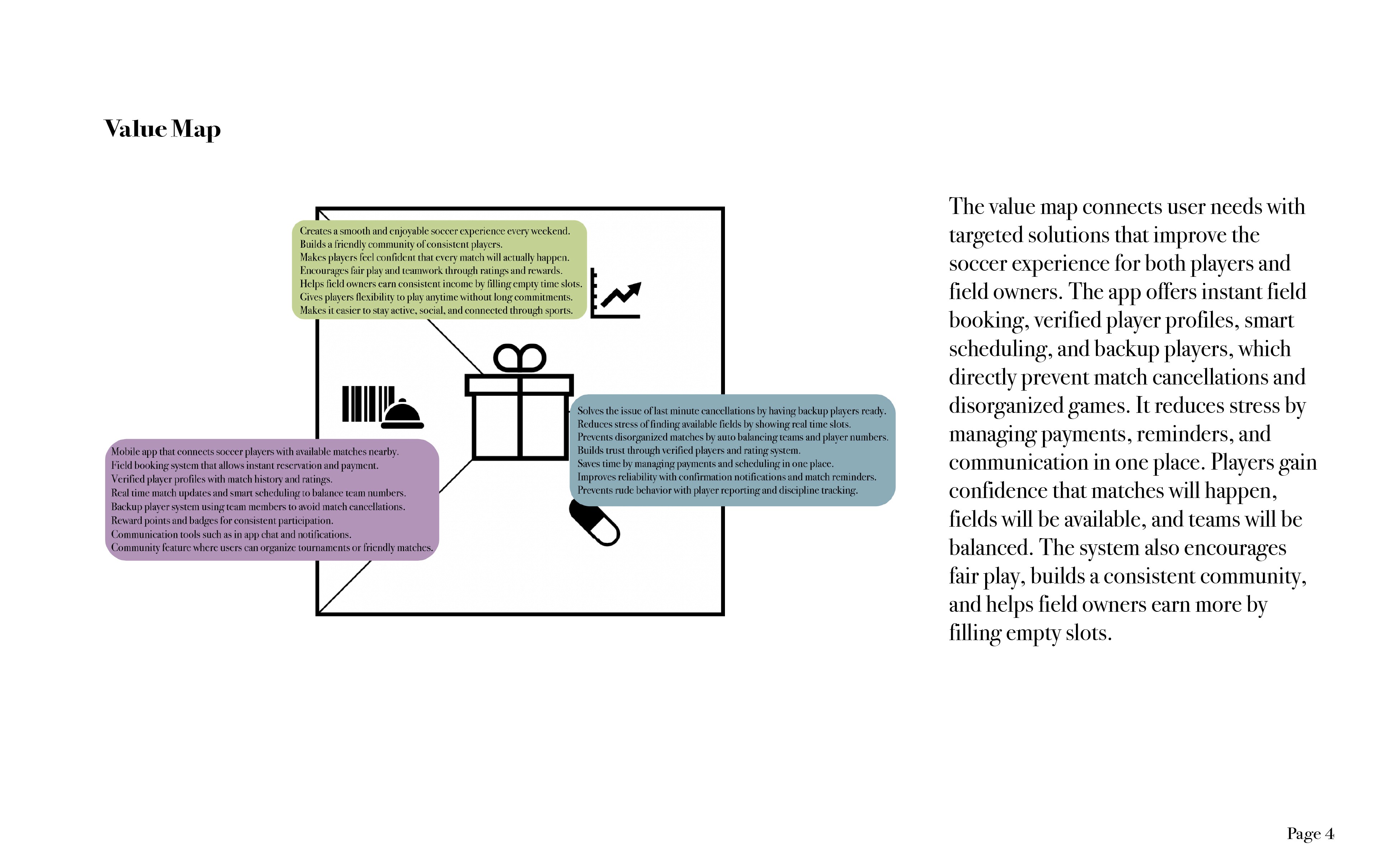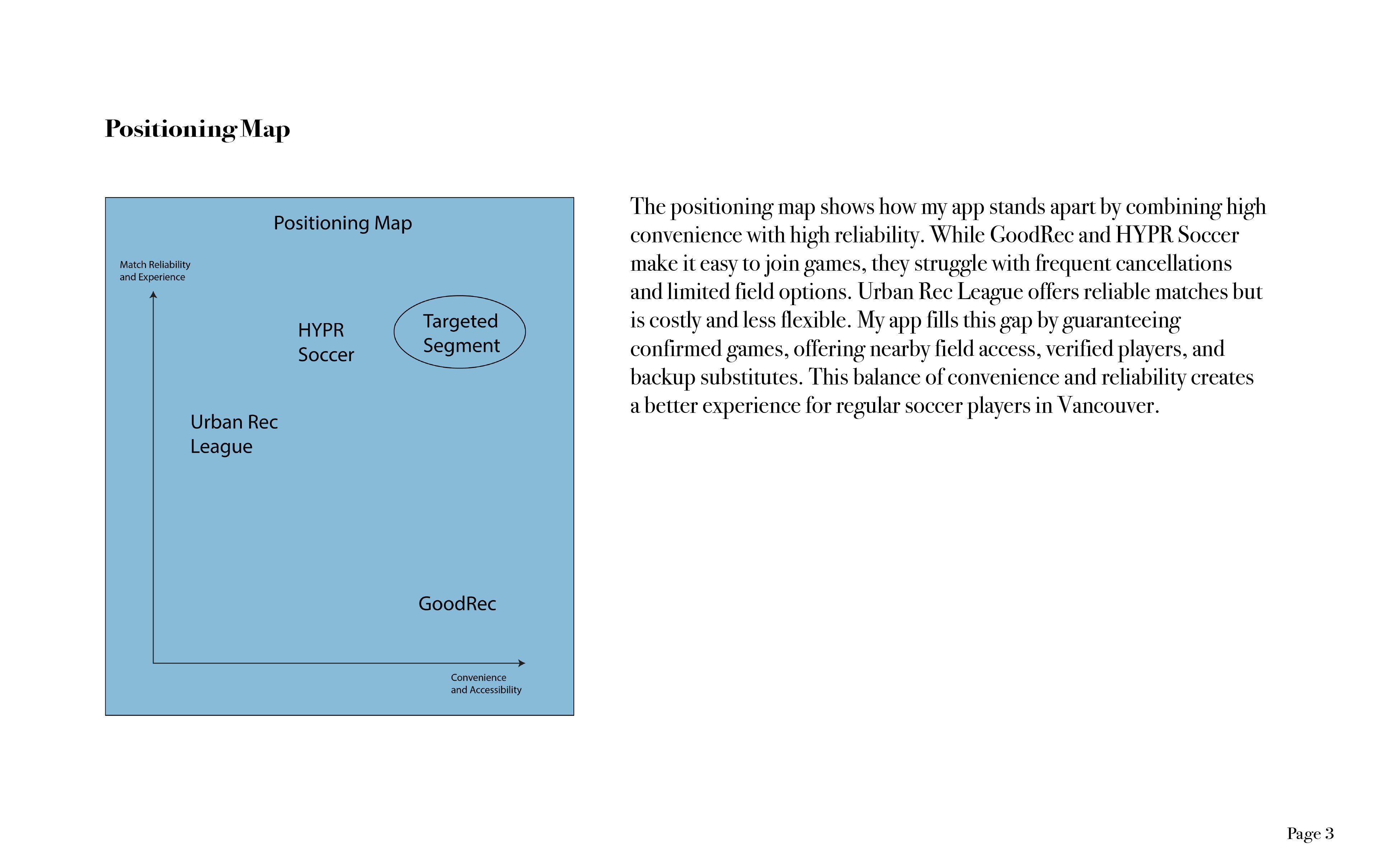 Organizing casual soccer matches is often messy. Players deal with scattered messaging, unclear availability, last minute changes, and no central platform that connects teams, fields, and schedules. The challenge was to understand the real pain points and build a clear strategic foundation for a new, modern sports brand.