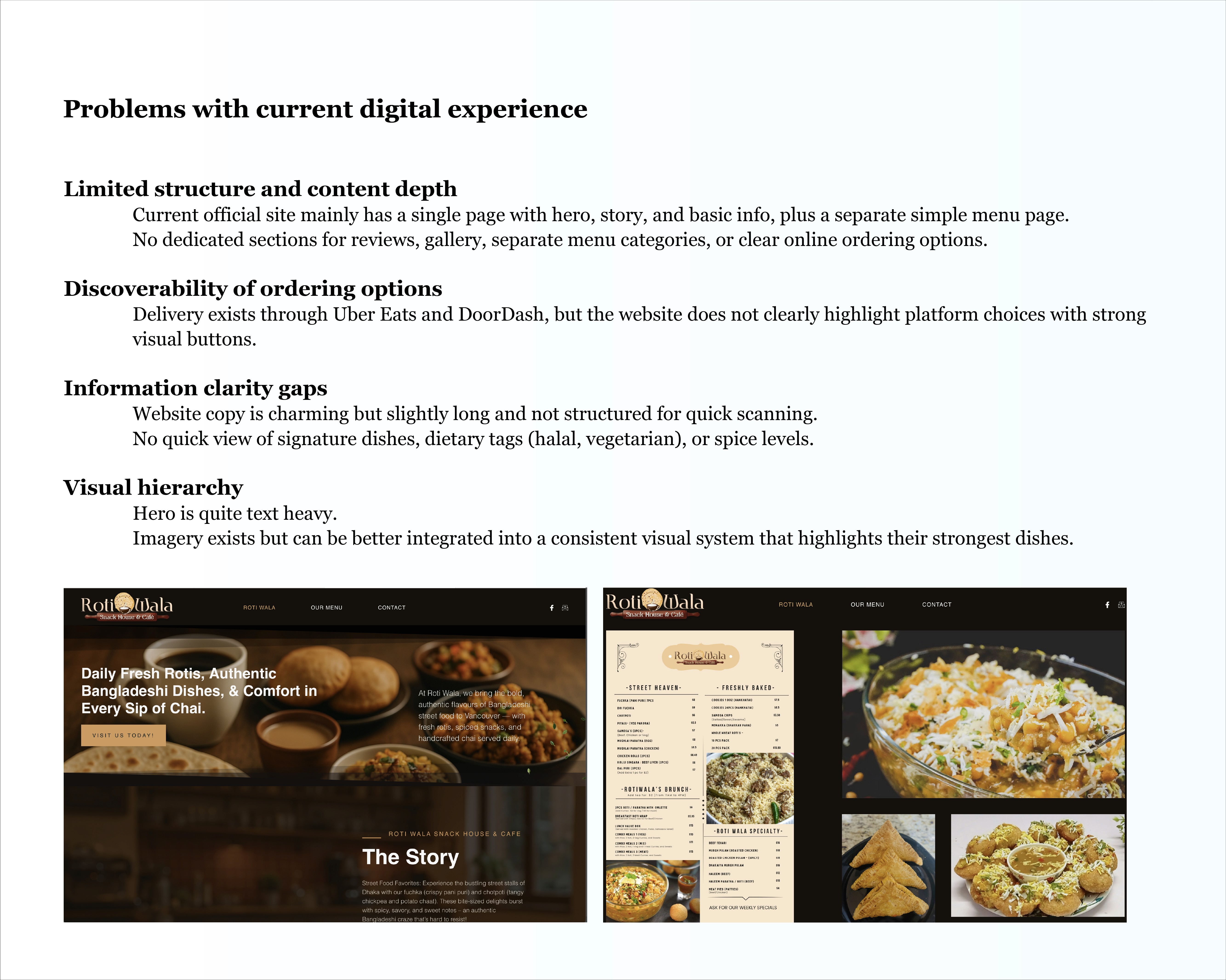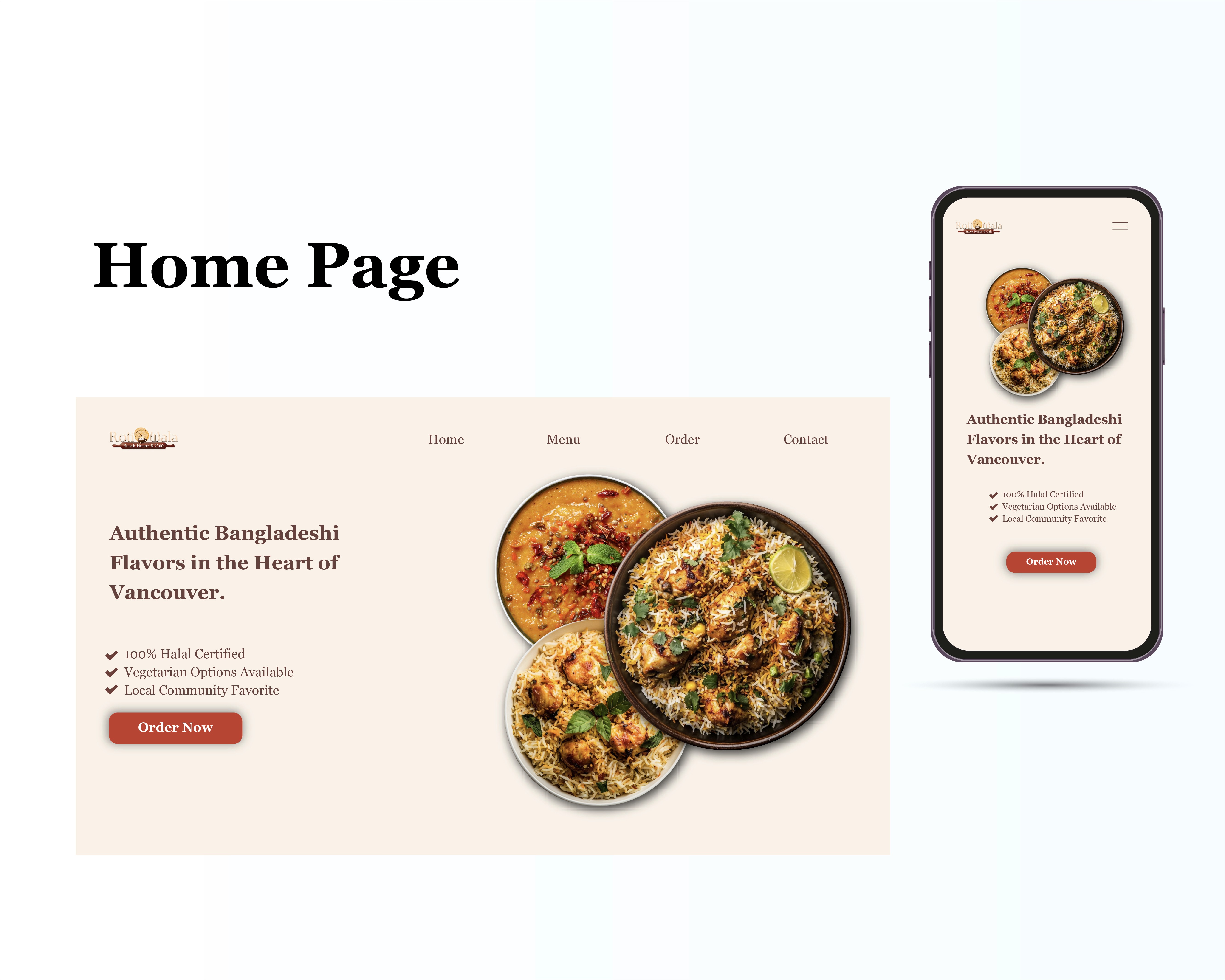 The new layout captures Rotiwala’s culture and food identity while giving users a cleaner, more intuitive experience. The improved hierarchy, menu preview, and bold food imagery make the website feel inviting and trustworthy.