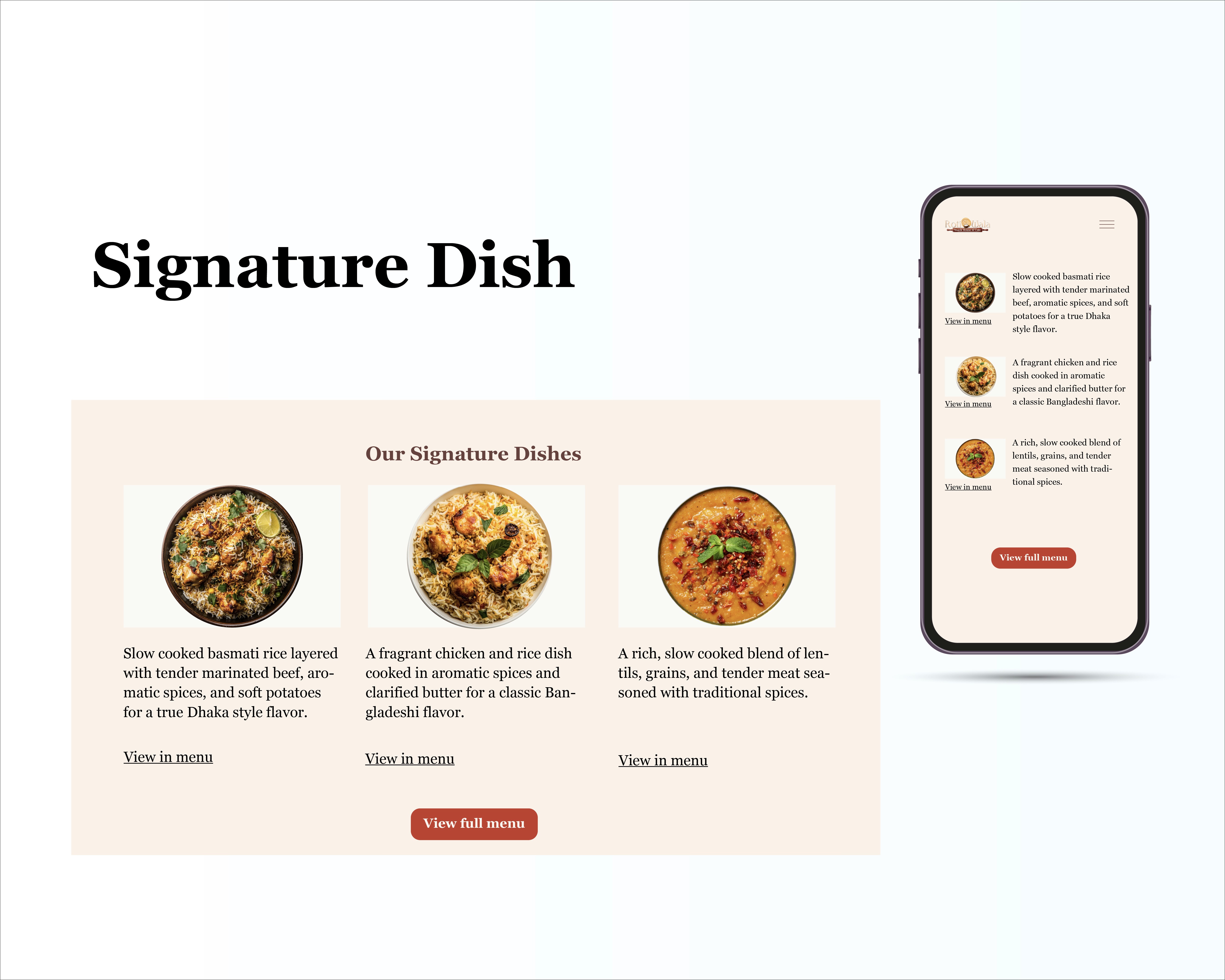 A high fidelity website mockup that brings clarity, warmth, and modern design to a local Bangladeshi restaurant.